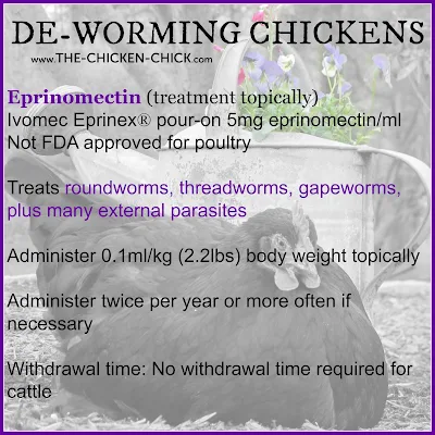 Ivermectin pour-on, applied to the dorsum of chicken's neck; 1 driblet for tiny chickens, 3 drops for bantams, four for lightweight birds, 5 for large birds in addition to vi for heavy breeds.